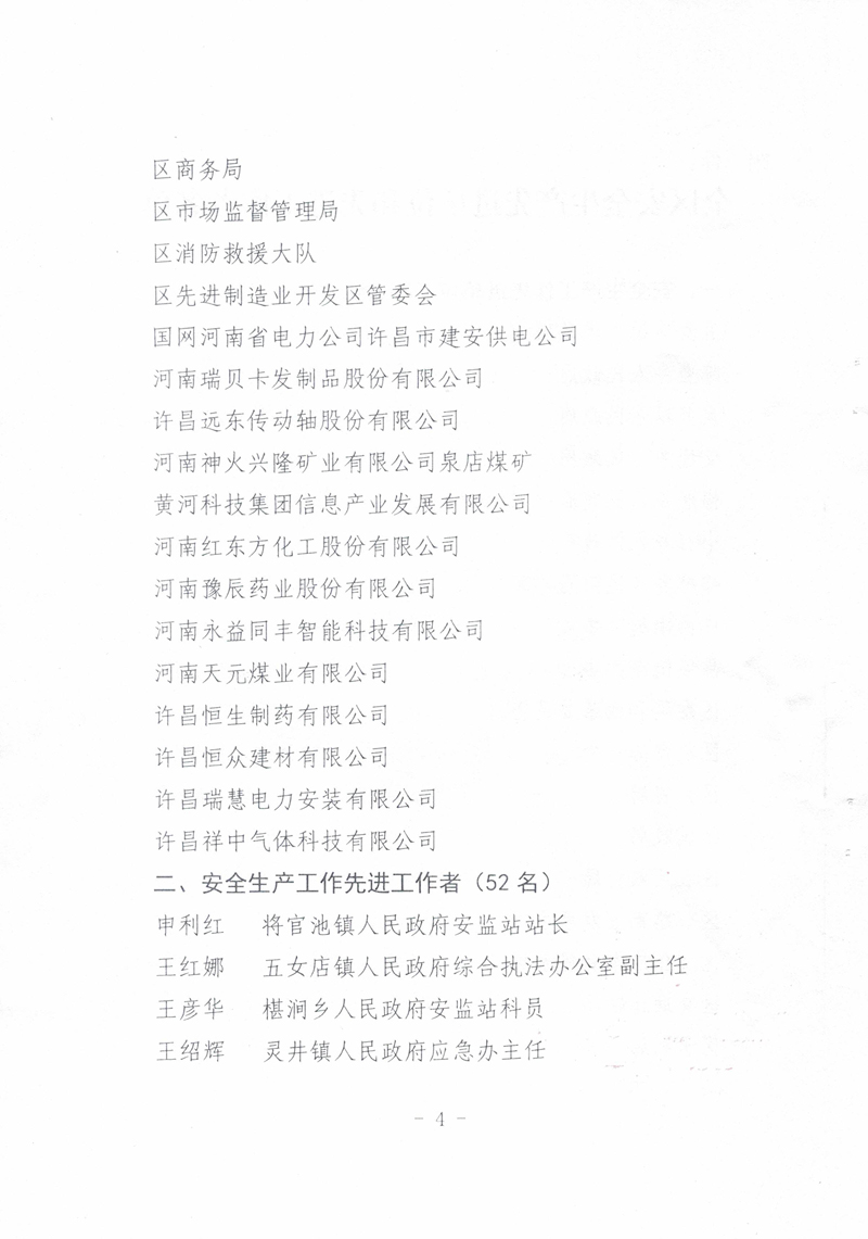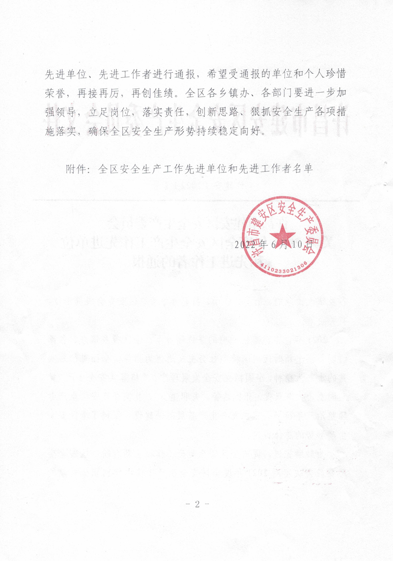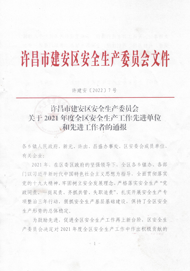 2021年,我公司以習(xí)近平新時(shí)代中國(guó)特色社會(huì)主義思想為指導(dǎo),全面貫徹落實(shí)黨的十九大精神,牢固樹(shù)立安全發(fā)展理念,嚴(yán)格落實(shí)安全生產(chǎn)“黨政同責(zé)、一崗雙責(zé)、齊抓共管、失職追責(zé)”,狠抓安全生產(chǎn)基層基礎(chǔ)建設(shè),排除潛在的安全隱患,保持了廠(chǎng)區(qū)安全生產(chǎn)形勢(shì)的總體穩(wěn)定。故許昌市建安區(qū)安全生產(chǎn)委員會(huì)對(duì)我公司在2021年度安全生產(chǎn)工作中的積極貢獻(xiàn)進(jìn)行了表彰,授予于“全區(qū)安全生產(chǎn)工作先進(jìn)單位”稱(chēng)號(hào)。